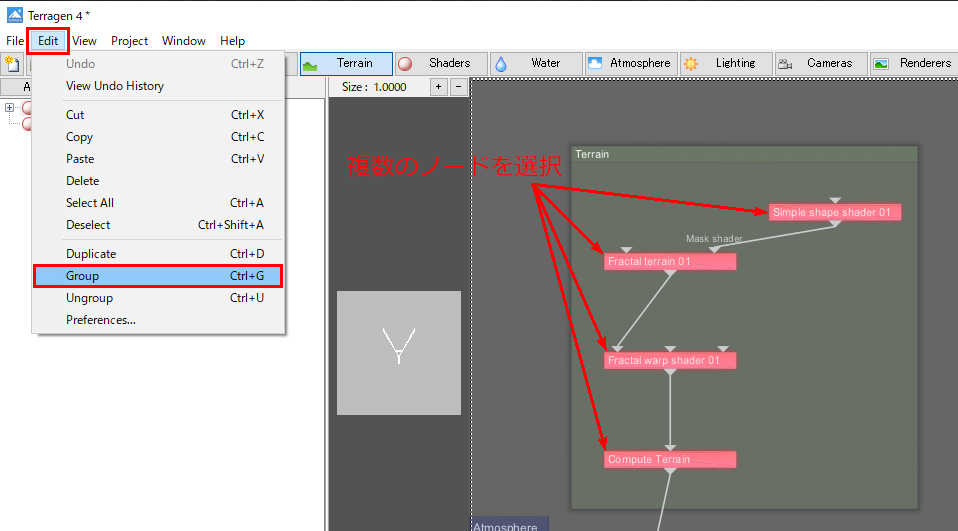 グループを作成する最も簡単な方法は、いくつかのノードを選択して[Ctl + G]を押すことです。グループ化したいノードを選択し、メインメニューから【Edit】 -> 「