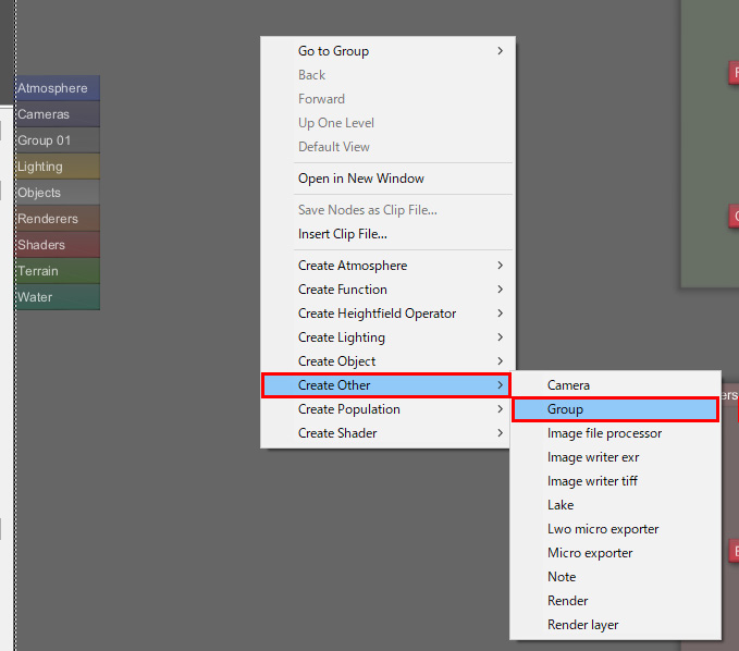 ノードネットワークの枠内を右クリックして「Create Other」-> "Group"を選択すると、空のグループを作成する事が出来ます。