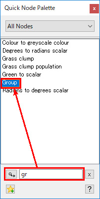 あるいは、ノードネットワークの枠がアクティブな時に、[N]または[Tab]を押してクイックノードパレットを表示し、"group(サンプル画像は頭文字の"gr")"という単語の入力を始め、ノードリストから「Group」という単語をダブルクリックします。ノードリストで「Group」という単語がすでにハイライトされている場合は、[Enter]キーを押すだけです。