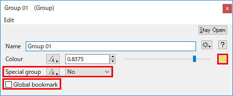 グループの名前を変更するには、グループノードをダブルクリックして新しい名前を入力し、カラーアイコンをクリックして別の色を選択します。グループの色を変更できます。Terragenはこのパラメータをシーンのデフォルトグループを識別するために内部的に使用しているため、ユーザー定義のグループでは、「Special Group」パラメータを常に"No"に設定する必要があります。「Global Bookmark」パラメータがチェックされている場合、ブックマークはすべてのノードネットワーク枠の左側に表示されますが、チェックを外すと、ブックマークが存在するローカルのノードネットワーク枠にのみ表示されます。例えば、