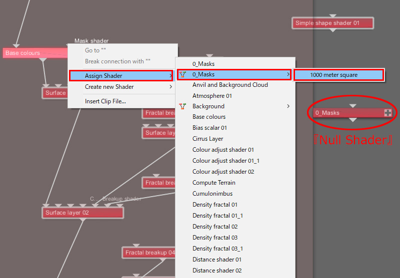 これを回避する1つの方法は、シーンに『Null Shader』ノードを追加し、名前を「0_Masks」のような名前に変更して、ノードリストの一番上に表示させます。『Null Shader』ノードを右クリックして内部ネットワークを開き、そこに『Simple Shape Shader』ノードを作成します。別の方法として、既存のノードをカット&ペーストして『Null Shader』ノードの内部ネットワークに貼り付ける事も出来ますが、その場合はマスクが使用されていた場所にマスクを再割り当てする必要があります。内部ノードビューを終了し、『Simple Shape Shader』を『Base colours』のマスクとして割り当てると、ノードリストの一番上、「0_Masks」という見出しの下に内部ネットワークアイコンのついた「0_Masks」が表示されます。