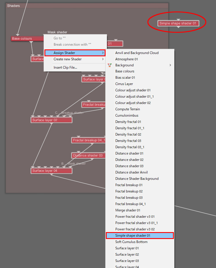 Simple Shape Shader』ノードを追加します。『Base colours』シェーダノードのマスクとして『Simple Shape Shader』を割り当てようとすると、名前を変えない限りシェーダはノードリストの最後にアルファベット順で表示されます。このリストに表示されるノードの数はシーン作成過程で多くなり、最後尾まで表示させるとかなり長くなる可能性があり、『Base colours』マスクとして割り当てると、接続線がノードネットワーク全体に渡って伸び、複雑なシーンに視覚的な混乱を招く可能性があります。