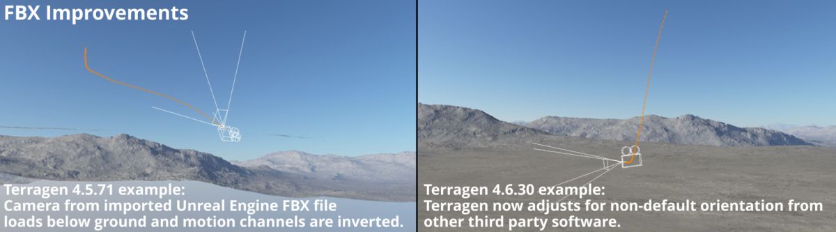 カメラ が、地面の下に配置され、モーションチャネルが反転していました。Terragen 4.6からは、Terragenが他のサードパーティソフトウェアのデフォルトでない方向を調整するようになりました。
