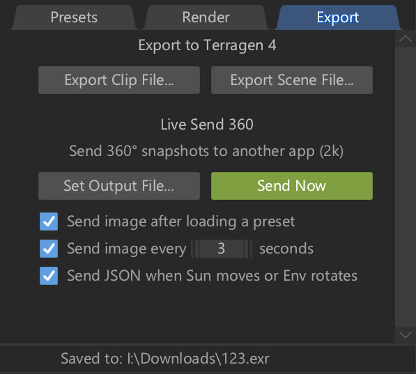 Terragen Skyは、Radiance HDR(.hdr)出力に対応しました。このオプションは、レンダリング画像の保存、Live Send 360の設定、プリレンダリングプリセットのコピーの保存時に利用できます。