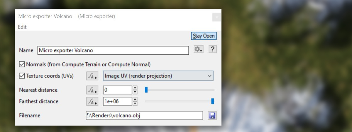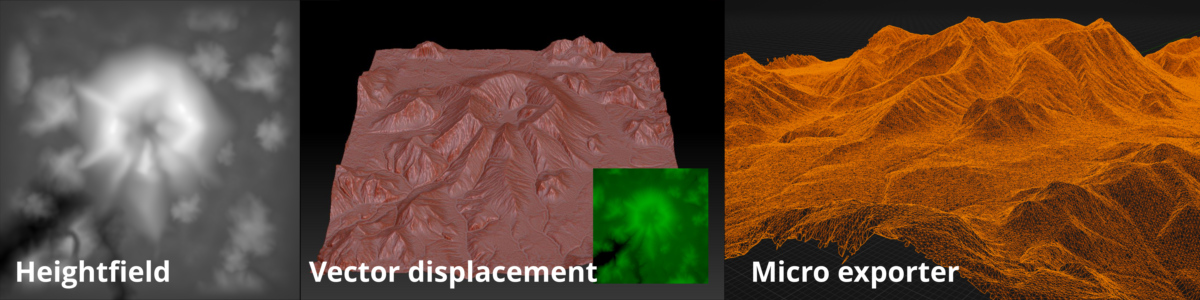 張り出した地形を含むあらゆる地形は、『Micro Exporter』経由で3Dメッシュとしてエクスポートできます。エクスポートされるメッシュのディティールレベルや、OBJやFBXなどの保存形式を完全にコントロールする事が出来ます。