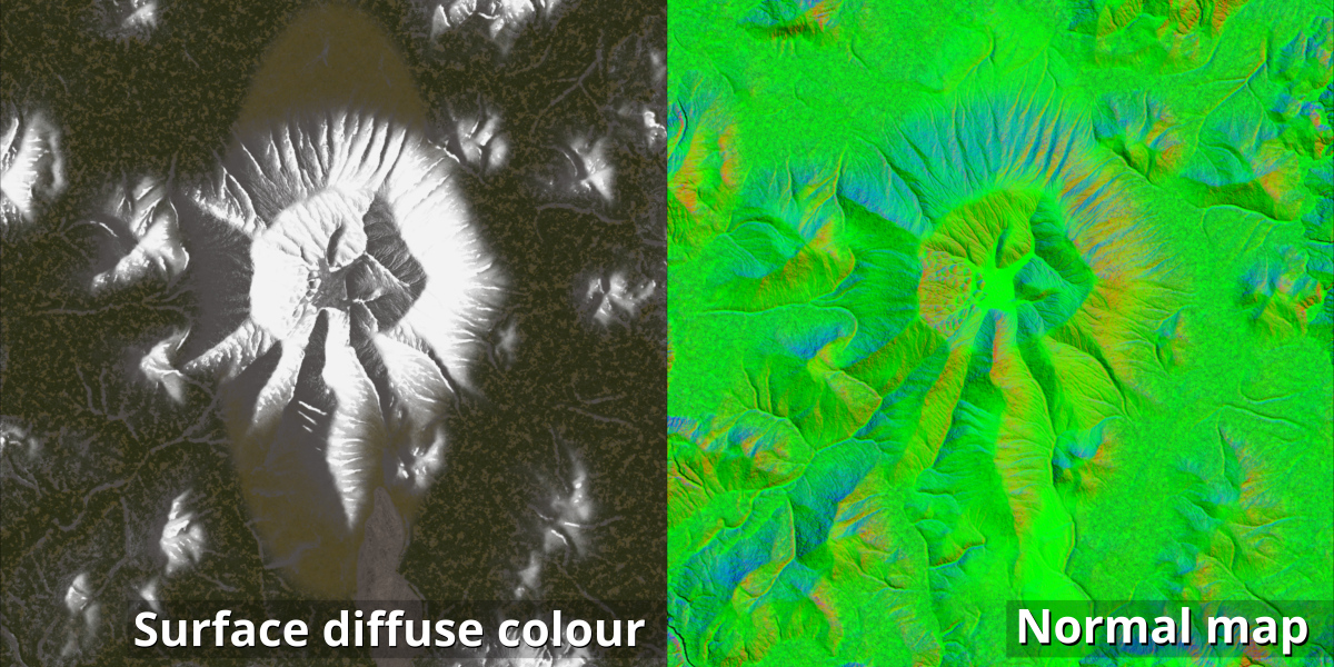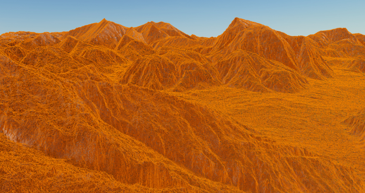 Terragen地形は、『Micro Exporter』経由でジオメトリとしてエクスポートされ、サーフェスカラーと法線のテクスチャマップが含まれています。Blenderにインポートして読ませました。