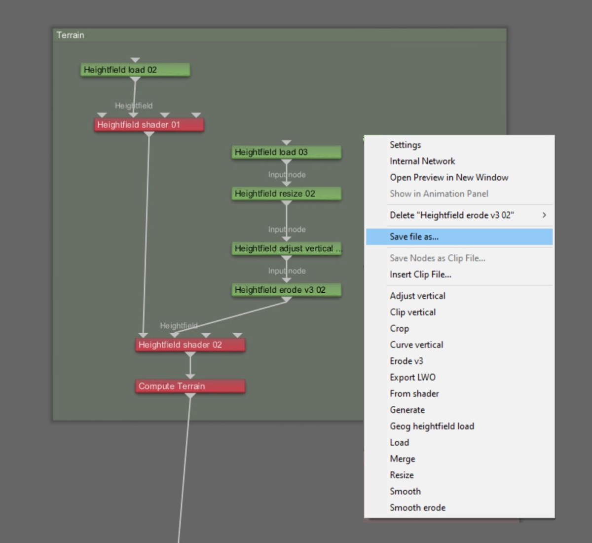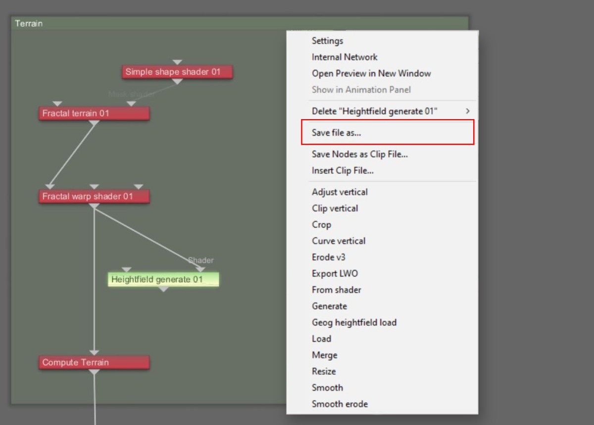 [Generate Now]ボタンをクリックしてハイトフィールドが生成されたら、ハイトフィールドのオペレータノードを右クリックし、コンテキストメニューから"Save file as..."を選択してエクスポートできます。ファイル形式はEXR、TER、RAW、TIFのに対応しています。
