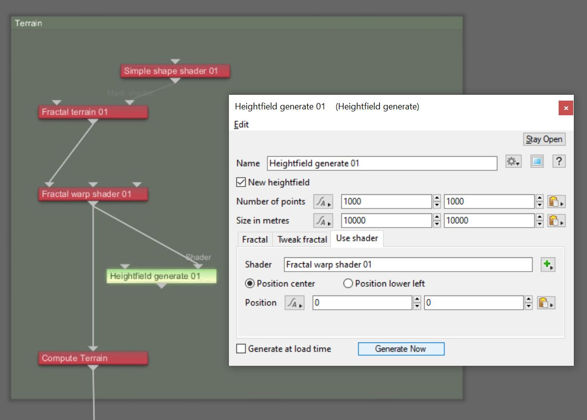 Terragenでは、プロジェクトに『Heightfield generate』ノードを追加し、その「Shader」入力をプロシージャル地形を構成する最後のノードからの出力に接続するだけで、プロシージャル地形からハイトフィールドデータを生成できます。