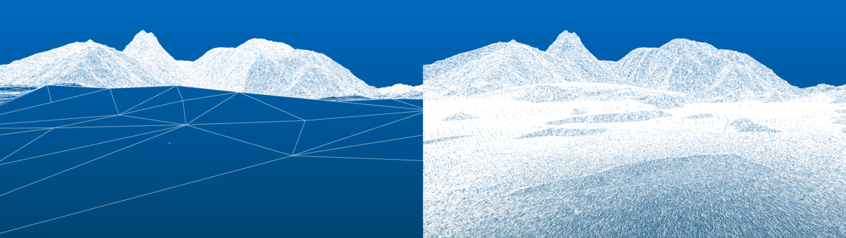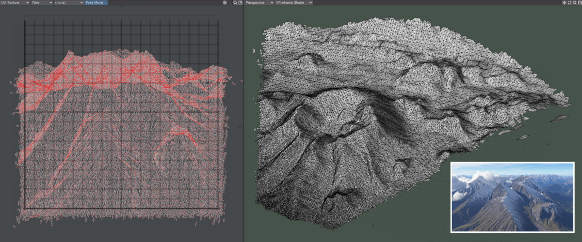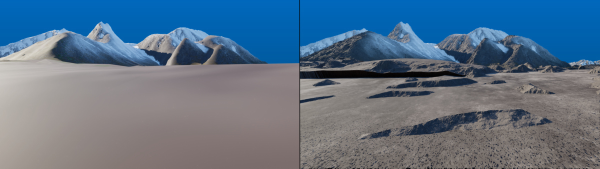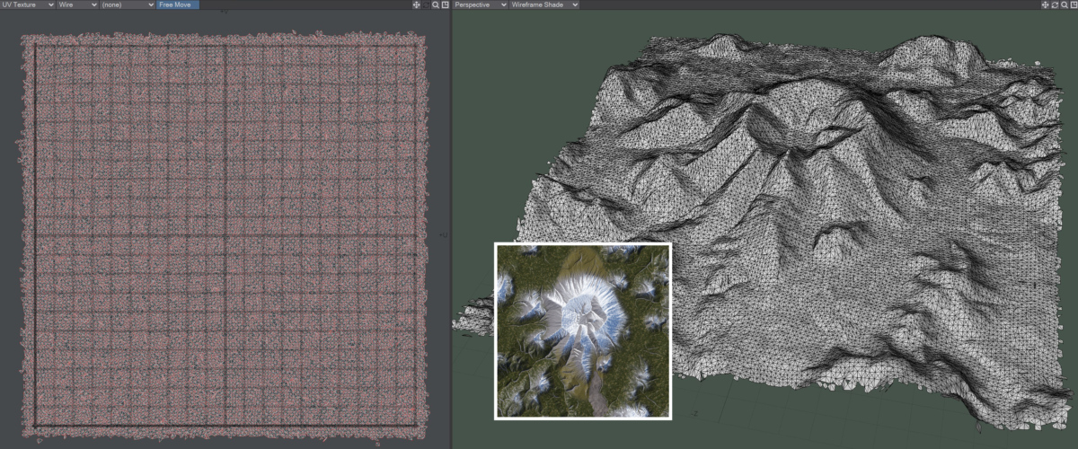 下の画像では、右側のジオメトリが透視カメラの位置からエクスポートされています。手前のポリゴンが少なく、凹凸のある地面の特徴に合わせている事に注目してください。これを、地形のはるか上空からエクスポートされた左側のジオメトリと比較してください。ほんの数個のポリゴンだけで手前のエリア全体を定義しているのがわかりますか?
