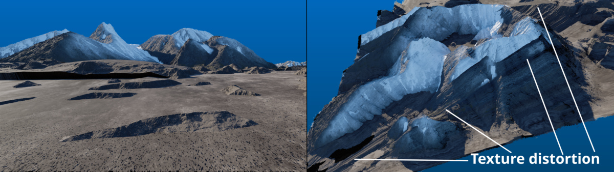 テクスチャマップでも、テクスチャを貼った地形を間近で見ると、同じような状況になることがあります。左側の画像では、テクスチャマップは地形の上空にある正投影カメラからエクスポートされています。右側の画像は、透視レンダリングカメラの位置からエクスポートされています。左側の地形テクスチャが鈍くぼやけているのに比べて、右側のテクスチャは鮮明でディティールに満ちていることに注目してください。