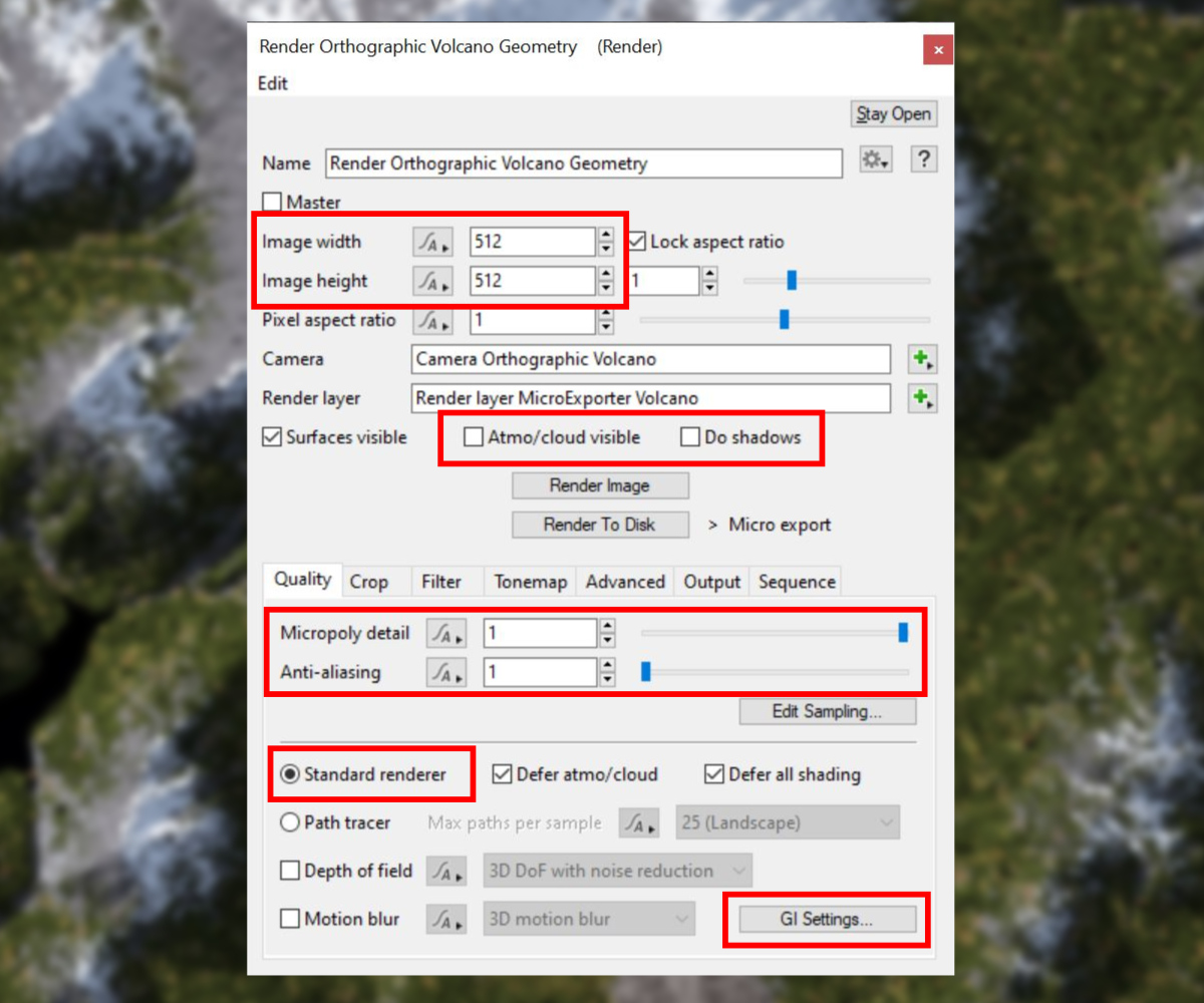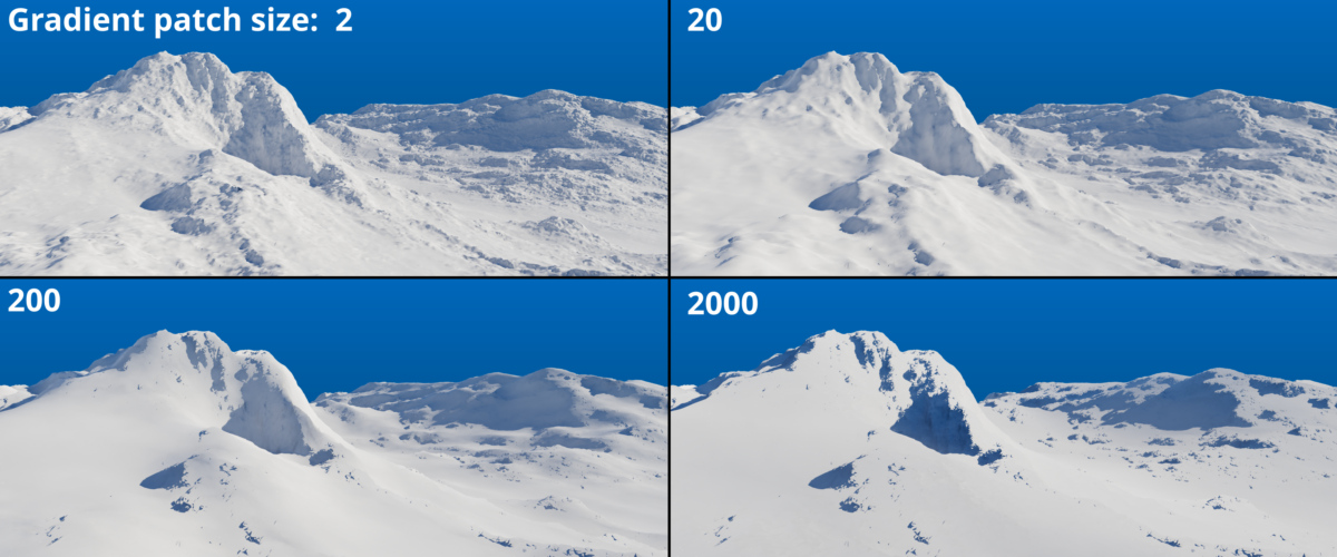 出力メッシュのディティールレベル(品質)は、レンダーノードの"Image width"、"Image height"、"Micropoly detail"パラメータによって制御されます。画像の幅と高さの値を"1024"に設定し、"Micropoly detail"の値を"1.0"に設定して生成されたメッシュは、画像の幅と高さの値を"2048"に設定し、"Micropoly detail"の値を"0.5"に設定して生成されたメッシュと、画像の幅と高さの値を"512"に設定し、"Micropoly detail"の値を"2.0"に設定されたメッシュと実質的に同じになります。この関係を理解することで、ニーズに応じて低解像度のジオメトリと高解像度のジオメトリの両方を生成する事が出来ます。