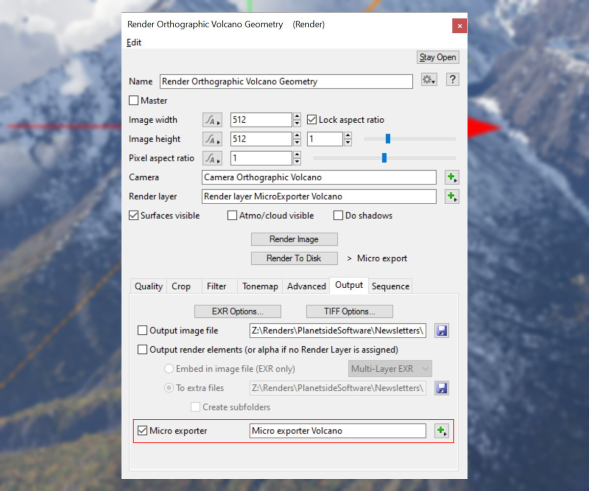 Terragen 4 Professionalでは、正投影カメラだけでなく、パースペクティブ(透視)カメラからも地形をエクスポートできます。