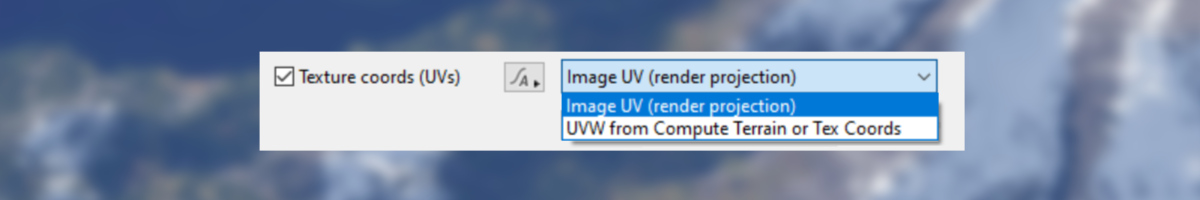"UVW from Compute Terrain or Tex Coords"を選択すると、最後に『Compute Terrain』ノードまたは『Tex Coords』ノードによって決定された3Dワールド空間座標がエクスポートされたジオメトリと供に保存されます。3Dワールド空間座標の保持は、特定の場合に役立ちます。例えば、エクスポートされたOBJまたはFBXジオメトリをTerragenにインポートし直して、さらにディスプレースメントやテクスチャの修正などの操作が必要な場合です。