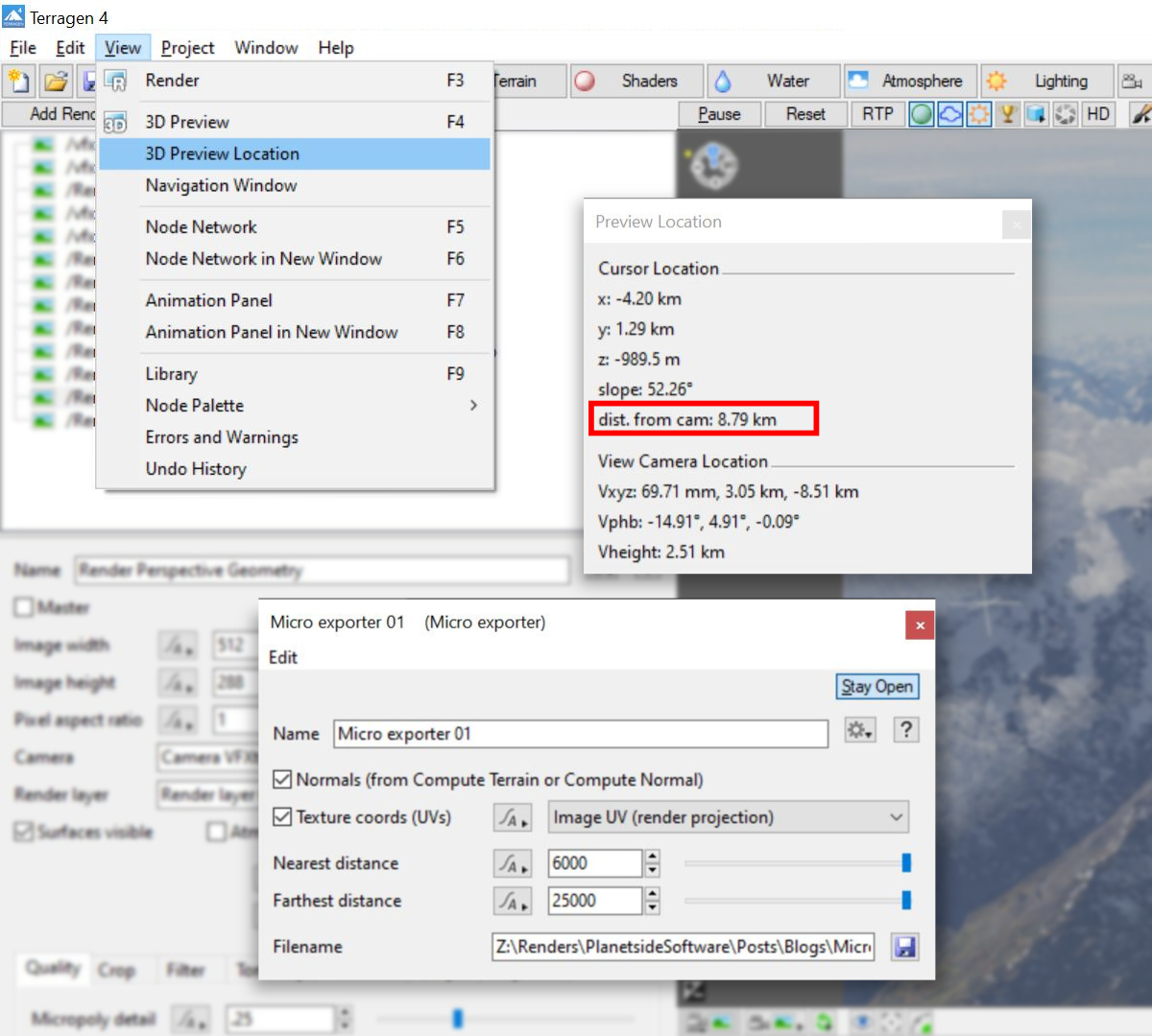 "Nearest Distance"と"Farthest Distance"パラメータを使用すると、その制限内の地形のみをエクスポートできます。これらの値はカメラの位置に基づいており、メートル単位で表されます。【View】メニューの「3D Preview Location」ツールを使用すると、カメラからの正確な距離を求める事が出来ます。