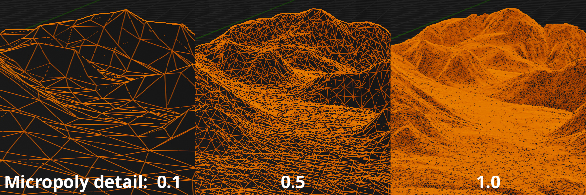 画像の幅と高さの値は、3つのメッシュすべてで(512 x 512)でした。"Micropoly detail"の値のみを変更しました。
