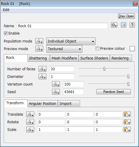 Seed | シード | この数値ごとにパラメータが『Rock』オブジェクトのジオメトリのランダムな側面を生成するために振り分けられるので、同じ数値を入れる事で同じ形を作る事も出来ます。新しい『Rock』オブジェクトごとに新しいシード値が生成され、各『Rock』オブジェクトと『Rock』のポピュレーションが互いに同じ形にならないようにするのに役立ちます。例えば、同じ設定とシード値を持つ2つの『Rock』のポピュレーターは、まったく同じ場所にインスタンスを生成します。これを実現したい状況もあるかもしれませんが、その場合は両方のポピュレーションが同じシード値にして使用することが重要です。 |