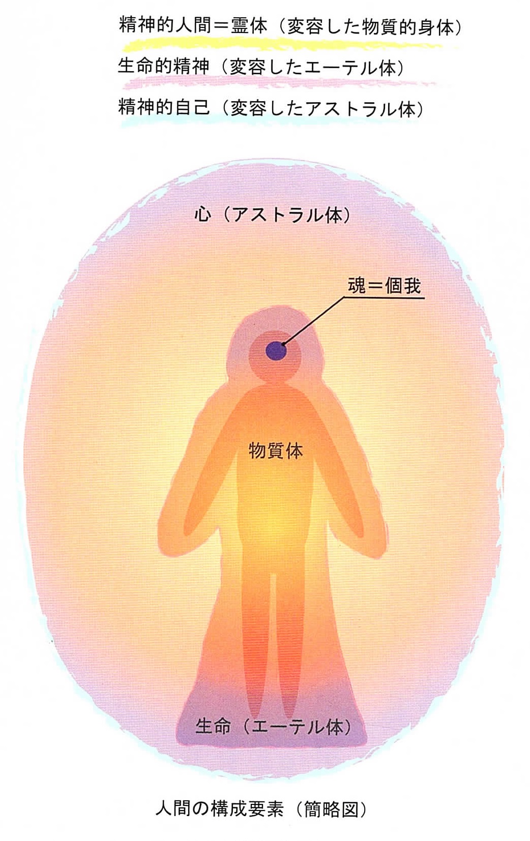 シュタイナーは人間の本質に関する研究も行った。通常の人間が、人間において目という感覚器官を通して知覚することができる存在を