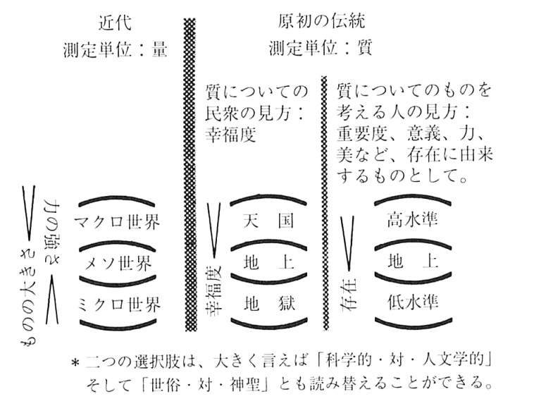 近代科学はただ一つの存在論的レベルしか必要としない。つまり物質レベルである。このレベルの中において、科学は知覚可能な物質から始め、そして最後にはまた知覚可能な物質へと戻る。というのも、その仮説をいかに拡張していったところで、ついには、それを証明するためには、測定値を読みとることへ戻って行かざるをえないからである。その始まりと終わりの間に、仮説は見知らぬ世界へと入っていくかもしれない。その最もミクロの世界、マクロの世界においては、物質は奇妙な動き方をするからである。だが、そうだとしても、その仮説が扱っている物質(あるいはむしろ、物質=エネルギー)は、最初から最後まで、時間と空間という構図の中に存在するものだ、という事実は変わらない。たとえ、その時間と空間をいかに定義しなおそうと同じである。湾曲した空間なるものも、奇妙なものではあるが空間には違いないのである。宇宙のどんな片隅まで調べあげても、ある意味で科学の基本的な枠組みを守っていることになる。つまり、空間、時間、そして相互に転換可能な物質=エネルギーである。科学が完全にこうした枠組に収まってしまうという事実があるために、その中にあるものも、最終的にはそういう性質のものとされることになる。時空間的にあるという状態は、あくまで時空間的に存在する状態である。あるいは、もっと抽象度の高いレベルでいうなら、数は数である。そして、数は科学の言葉である。物体は、大きいか小さいかであり、力は、強いか弱いかであり、持続時間は、長いか短いかである。これはずべて数的に把握できることである。科学において、何かを異なった存在論的地位をもつものとして――つまり、より優れているもの、よりリアルなものとして――語るということは、ナンセンスとしか聞こえない。