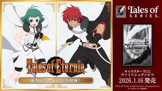 - TCG。ヴァイスシュヴァルツ、ヴァイスシュヴァルツブラウにテイルズオブシリーズがコラボ参戦。エターニアはヴァイスシュヴァルツの方。