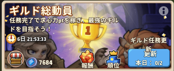 個人更新ではなく、画面右側のギルド任務更新ボタンは全体タスクの更新になる。一日2回まで使用可能なので使用時は以下を注意すること。
