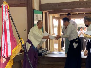 七段に昇段された大峰先生、六段に昇段された大金先生の経歴が支部長から紹介された後、師範である明間先生からのご祝辞を頂戴し、続いて矢渡しが厳かに執り行われました。