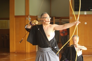 その後、参加者による一手礼射による祝射が行われた後、昇段されたお二人の先生によって、答礼の意を込めた一つ的射礼が披露されました。