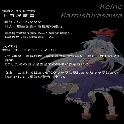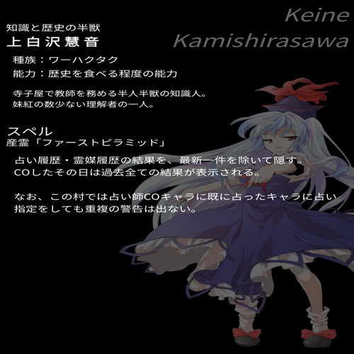 あとは初日から占い師にCOさせずに後半になってからCOさせると、覚える内容がかなり減って楽、ただし前半占い師が襲撃されないように、共鳴者や霊媒師をCOさせて囮にするなど工夫が必要