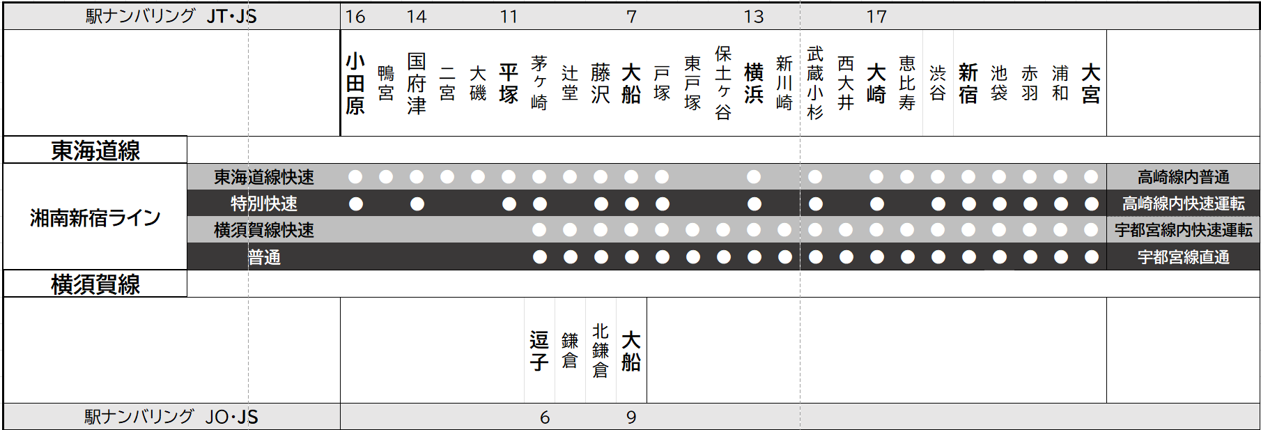 JR東日本電車運行情報 Wikipedia「湘南新宿ライン」(運行系統の概説・年表)。 tokyo-train-master:湘南新宿ライン 解説(停車パターンの整理)。 JR東日本(2001年プレスリリース:愛称運行開始の告知・初期本数)。 JR東日本(2004年ダイヤ改正版 PDF:池袋立体交差と増発の資料)。 |