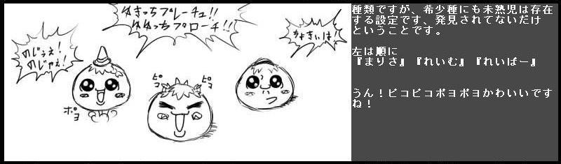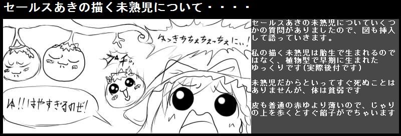 - 東南海ゆっくり加工所によると未熟児は腹から生まれる胎生出産よりも、植物出産で生まれる割合が多い、通常な赤ゆは実ってから2週間かかるが、未熟児はまだ髪や飾りが未熟な段階で生まれる。