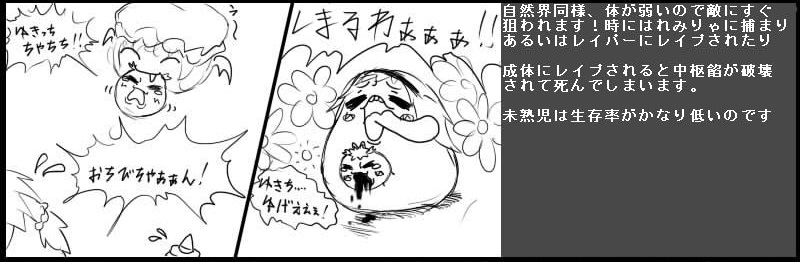 - さらに成体レイパーにレイプされると中核枢が破壊され、即死る。ので、未熟児は生存率が極めて低いのであろう。