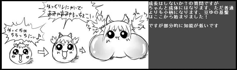 - 通常の赤ゆと比べて任振発生から出産までが速く、そのまま成長するが、同年代な子ゆ、成ゆと比べて小柄になる。