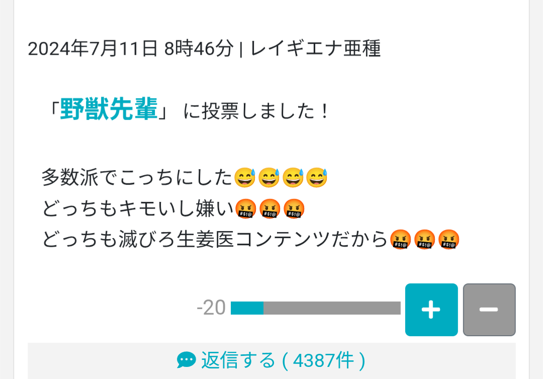 現在の総投票数は347票、コメント数は142、返信数は5654である。(*1)