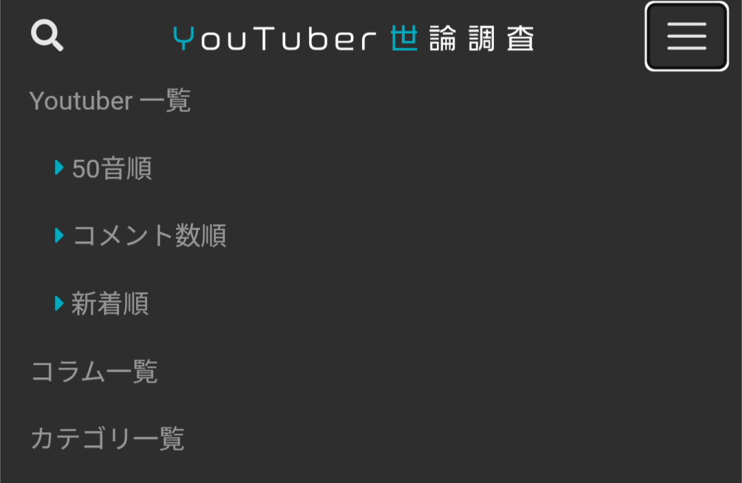 「YouTuber一覧」の「50音順」・「コメント数順」・「新着順」、「コラム一覧」、「コラム一覧」の「総選挙」・「アンケート」・「ニュース」へ飛べる。