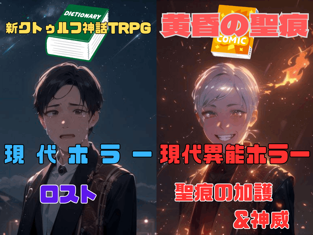 現代異能ホラーTRPG「黄昏の聖痕」を*新クトゥルフ神話TRPG(CoC)と比較しながら説明します。