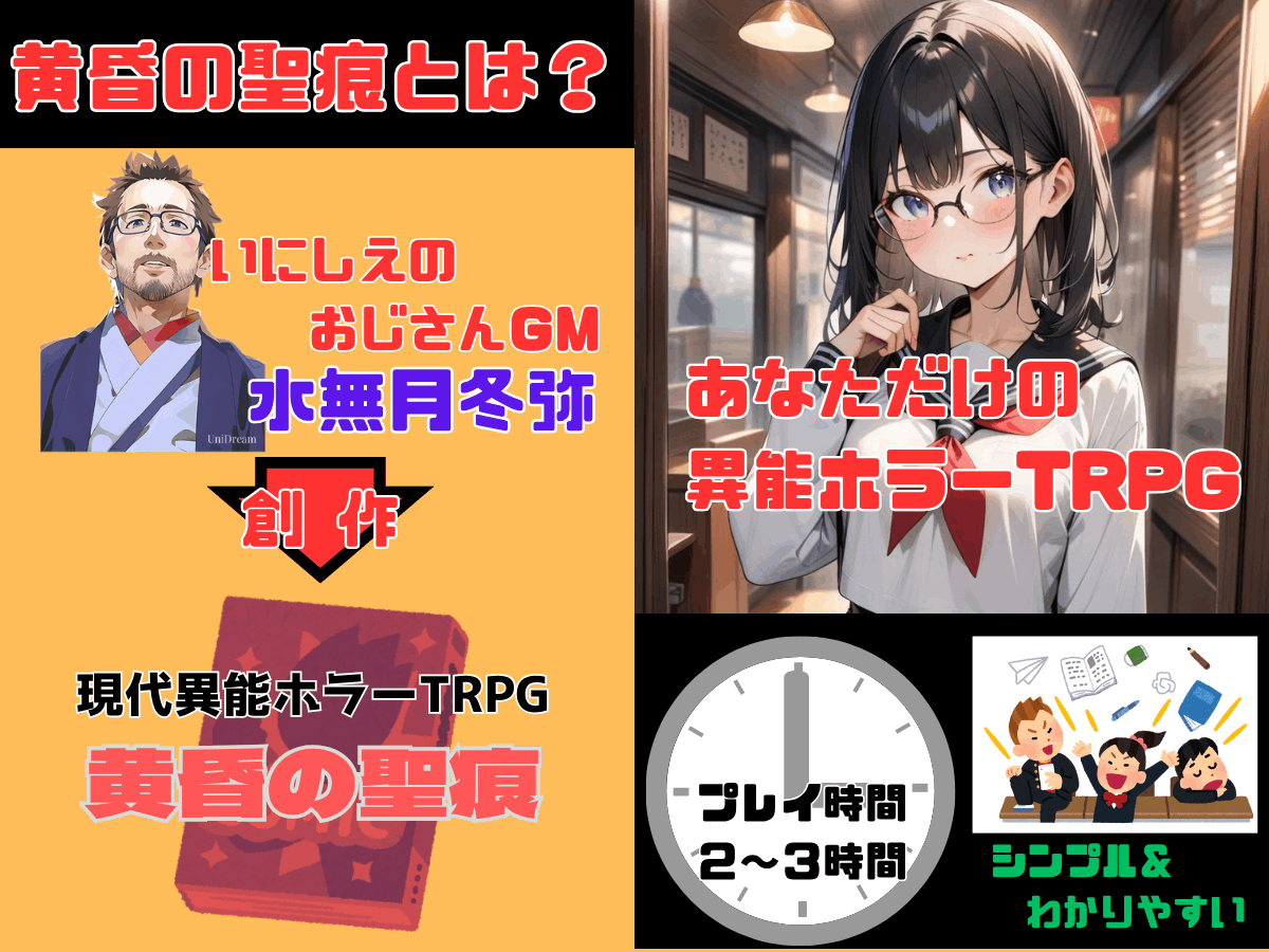 現代異能ホラーTRPG「黄昏の聖痕」は、いにしえのおじさんGM「水無月冬弥」が「自分がGMとして楽しめるTRPGを作ろう」として生み出したTRPGシステムです。