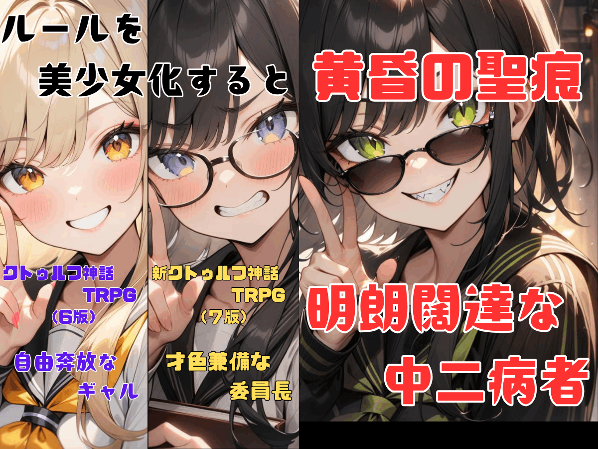 ルールのイメージを美少女化すると、CoC6版は「自由奔放なギャル」、7版は「才色兼備な委員長」となりますが、黄昏の聖痕は「明朗闊達な中二病者」といったイメージになります。