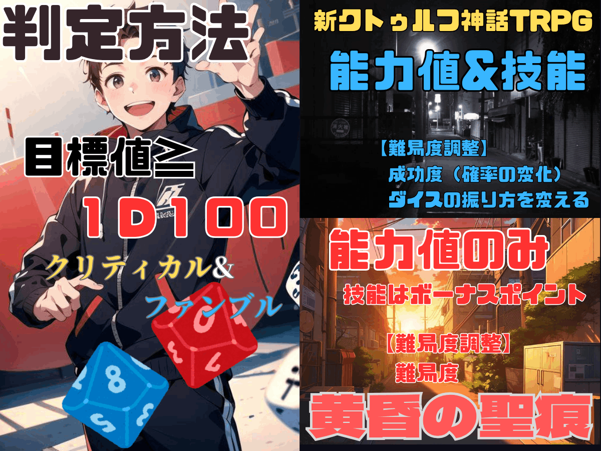 CoCと黄昏の聖痕の判定を比較すると、1D100を振り目標値以下なら成功、クリティカルやファンブルがあるのは、共通しています