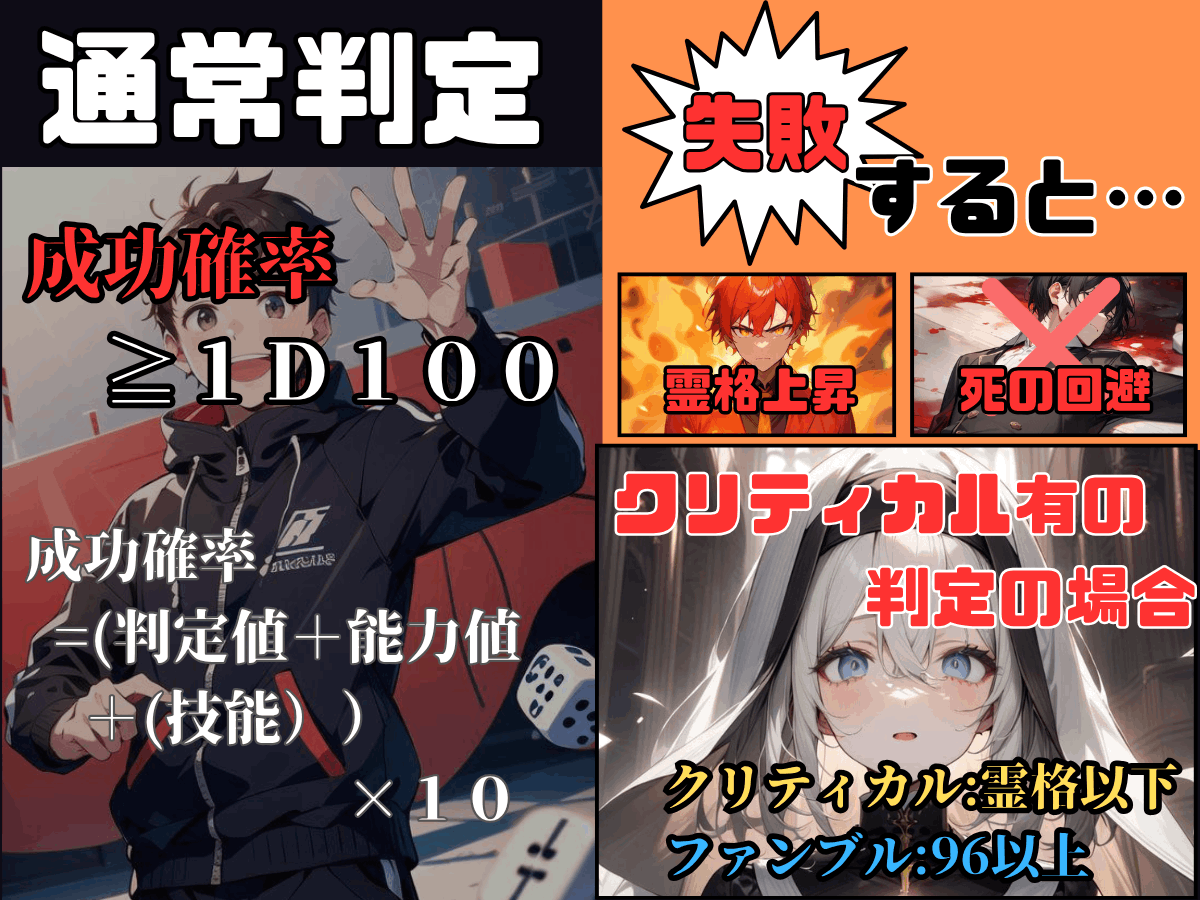 クリティカル有りの判定の場合、出目が霊格以下ならクリティカル、96以上ならファンブルとなります。