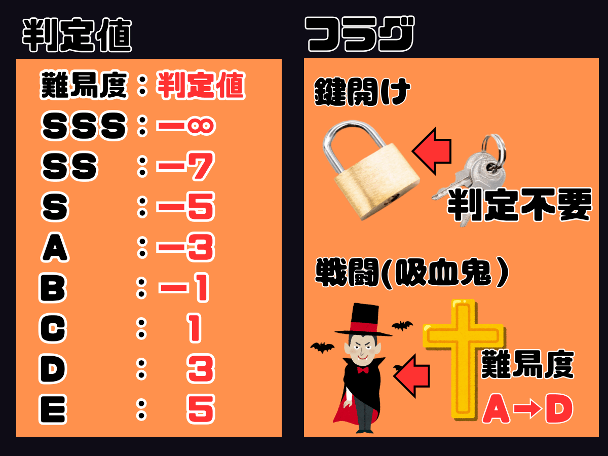 鍵開けの判定で鍵を使用したり、ドラキュラに十字架を向けるなど、判定の確率が上げる、もしくは判定不要になるロールをフラグといい、判定によってははフラグがある場があります。