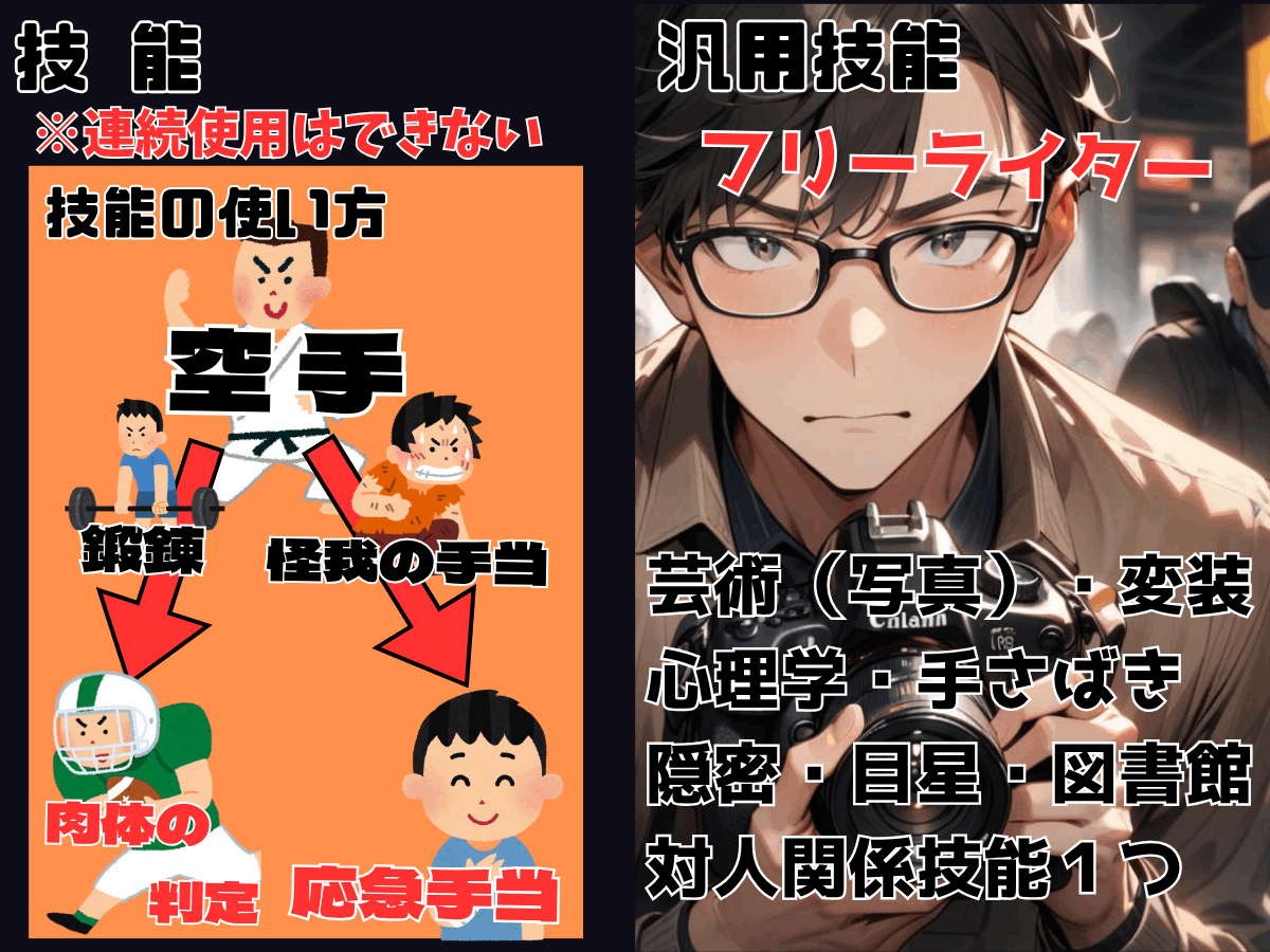 たとえば「空手」なら、体を鍛えている事から「肉体」に関する判定全般に使えたり、修行中、必要に応じて怪我を治してきた経験から「応急手当」の代用にも使えたりします。