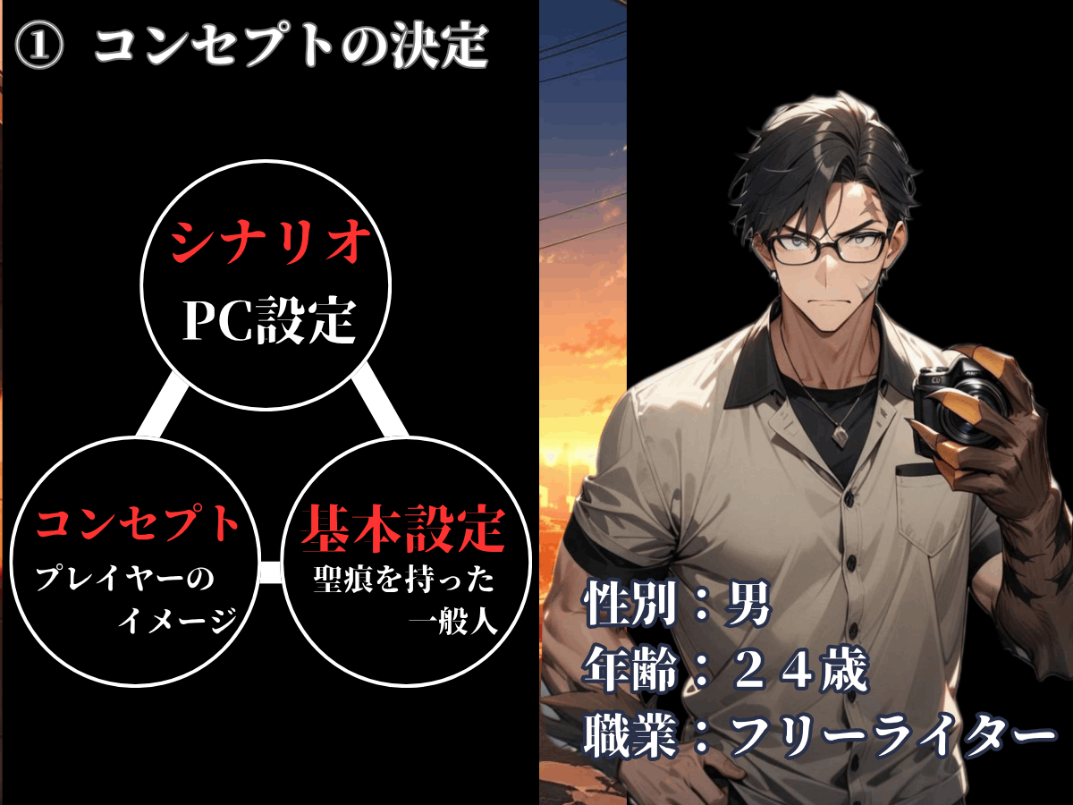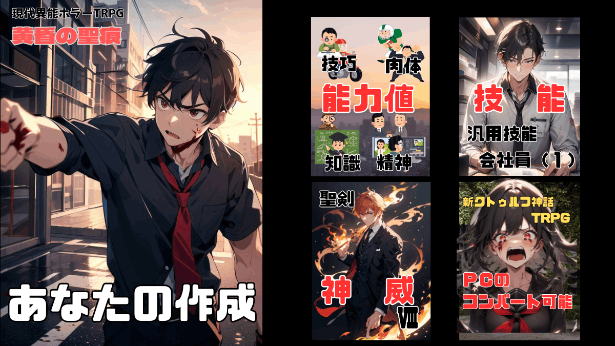 あなたは「奇妙な傷痕(聖痕)が刻まれたことで異能を得た、普通の一般人」であり、シナリオごとに用意された【PC設定】に沿って作られる存在です。