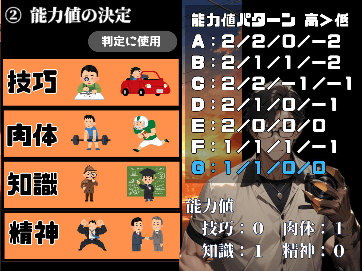 能力値のうち、【技巧】【肉体】【知識】【精神】を決定します。
