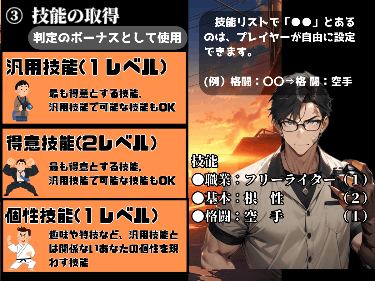 技能は、あなたの経験や才能、特徴や装備を表したもので、判定のボーナスとして使用します。