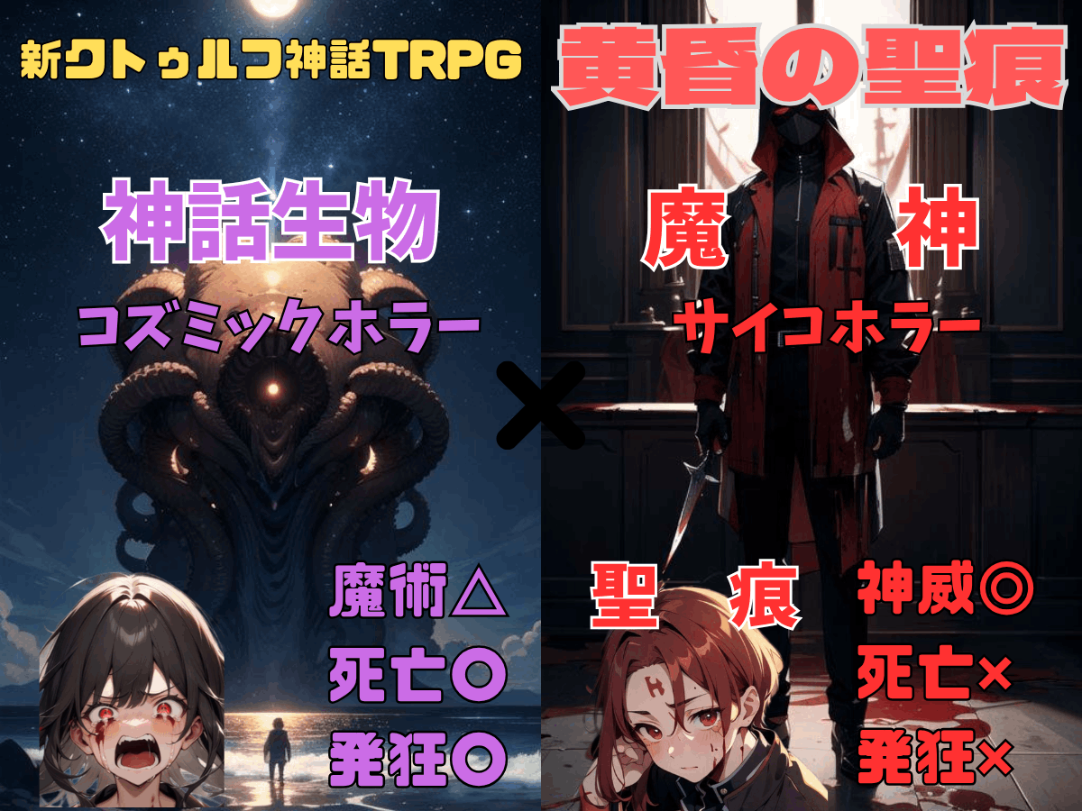 いっぽう、黄昏の聖痕は、狂気に堕ちた魔神が自分の欲望を満たすために事件を起こすサイコホラーです。PCは聖痕の加護で異能「神威」を使うことができ、死亡や発狂の心配はありません。