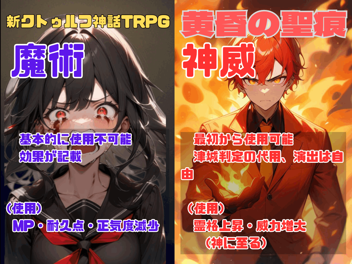 魔術は代償としてMPなどを消費しますが、神威は霊格を上げて判定を有利にします。