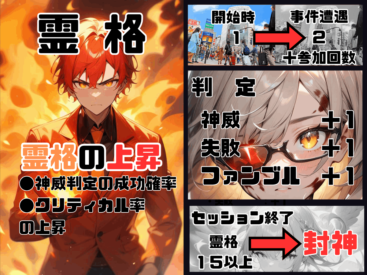 セッション中、霊格の数値は上昇していき、神威判定の成功確率は高くなり、クリティカル率も高くなります。
