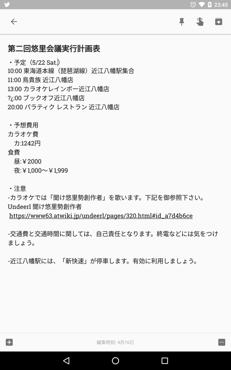 悠里会議は一応成功になったが、近畿圏からの集合であったとしても一日で集合して、懇談会をして、会議をするまでにはあまりにも時間がなさすぎるということで概念上のインド屋においては、「次回の悠里会議では、どこかに二泊以上泊まって行うべきではないだろうか?」という意見が集まった。次回もしくは次々回の悠里会議において「お泊り会」が実現されることを悠里勢は切に望んでいるが、かたや旅費、かたや時間設定などで問題点も多かったりするのであるのが現状である。2017/04/27にはまた話が出て、先生が来ることによって