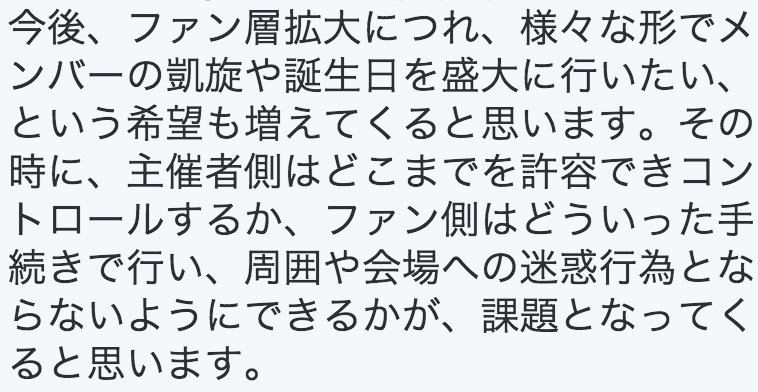 なりょ「真莉愛会」@2/13アンジュ佐賀 @naryoproject アンジュルム佐賀昼公演、アンコールでかみこ横断幕揚げました! かみこ気付いてくれて号泣! そしてスタッフさんに怒られ没収笑 かみこを感動させるミッションは成功したので、思い残すことはありません! スタッフさんにも謝ってきます! http://pbs.twimg.com/media/CbE6qT5UEAAno2h.jpg:orig 2016/2/13 16:10:46 · Twitter for iPad https://twitter.com/naryoproject/status/698520501426073600 なりょ「真莉愛会」@2/13アンジュ佐賀 @naryoproject アンジュ佐賀夜公演終了。没収されていた横断幕を取りに行く。 怒られることはなかったが、こちらとしては丁重に謝罪。 そして、「明日の福岡公演では、会場内では出したりしません。ただ、外でファンの人達で写真撮ったりするので、ご了承ください。今日は本当にすみませんでした」と伝える。 2016/2/13 20:09:22 · Twitter for iPad https://twitter.com/naryoproject/status/698520533923602432 なりょ「真莉愛会」@2/13アンジュ佐賀 @naryoproject そしてかみこ握手で、 俺「横断幕見えた?」 かみこ「見えましたよ!ありがとうございます!」 と言ってもらえた事で大満足。 いろんなヲタさんから、「横断幕よかったよ〜」と言ってもらえ、 「ありがとうございます、でも怒られちゃいましたテヘッ\(//∇//)\」 とお話しできました。 2016/2/13 20:13:22 · Twitter for iPad https://twitter.com/naryoproject/status/698520558305091588 なりょ「真莉愛会」@2/13アンジュ佐賀 @naryoproject メンバーみんな、こっちに気付いてる!もちろんかみこも! かみこは泣いてはいなかったが、喜びを噛み締めつつパフォーマンスしてる(ように見えた) そして大器晩成も曲の後半に差し掛かる頃、スタッフ(の上の方の人)が来て、横断幕を下ろせ、と指示された。。。 2016/2/13 21:20:49 · Twitter for iPad https://twitter.com/naryoproject/status/698520763905630208 なりょ「真莉愛会」@2/13アンジュ佐賀 @naryoproject まあさすがに曲中に横断幕を掲げるのは(最後方なので後ろの視界は遮らなくても)、安全上の問題からまずいかな、と思ったので、その時は素直に下ろすことにした。 MCの時にまた掲げればいいか、ということで。 2016/2/13 21:44:48 · Twitter for iPad https://twitter.com/naryoproject/status/698520776677298176 なりょ「真莉愛会」@2/13アンジュ佐賀 @naryoproject そして、大器晩成が終わり、年下メンから挨拶が始まる。 最初の挨拶は当然かみこ。 咄嗟に我々は、再度横断幕を掲げる! 「かみこ〜!かみこ〜!」 会場全体のコールに負けじと、僕も大声でかみこコールをしながら横断幕を掲げる! 2016/2/13 21:48:00 · Twitter for iPad https://twitter.com/naryoproject/status/698520809107664896 なりょ「真莉愛会」@2/13アンジュ佐賀 @naryoproject ステージ上のかみこを見ると、泣いてくれてるじゃないか。。。横断幕企画してよかった。。。 そんな感慨に浸る間もなく、先程のスタッフがまた現れ、横断幕を没収していってしまった。。。 2016/2/13 21:51:06 · Twitter for iPad https://twitter.com/naryoproject/status/698520825595432960 なりょ「真莉愛会」@2/13アンジュ佐賀 @naryoproject ×終焉 ◯終演 先程のスタッフさんが話しに来た。 俺「やっぱ(横断幕)ダメっすか最後方でも?」 スタッフ「気持ちはよく分かるんだけど、一つ例外を認めちゃうと、キリなくなっちゃうからね。ホントよく分かるよ」 僕が夜公演も入ることを伝えると、夜公演まで横断幕を預かる、と言われた。 2016/2/13 22:04:40 · Twitter for iPad https://twitter.com/naryoproject/status/698520847368085504 なりょ「真莉愛会」@2/13アンジュ佐賀 @naryoproject 頭ごなしに怒られたら逆らおうかな、とも考えたが、そうではなかったし、こちらが無断で(確信犯的に)やったのは事実だし、スタッフさんの言う事にも一理ある。何よりかみこに伝わった事で目的は十二分に果たした。という事で大人しく従う事にした大人の対応w 2016/2/13 22:08:16 · Twitter for iPad https://twitter.com/naryoproject/status/698520863218360320 なりょ「真莉愛会」@2/13アンジュ佐賀 @naryoproject 誤解が無いように書いておきますが、安易にスタッフ批判をしたいわけではなく、今回のスタッフ対応は致し方無しだと思います。但し、事前に横断幕の許可が下りたとは思えないので、結果自分としてもゲリラ的にやらざるを得なかったという事です。 2016/2/13 22:17:53 · Twitter for iPad https://twitter.com/naryoproject/status/698520876946329600 なりょ「真莉愛会」@2/13アンジュ佐賀 @naryoproject 今後、ファン層拡大につれ、様々な形でメンバーの凱旋や誕生日を盛大に行いたい、という希望も増えてくると思います。その時に、主催者側はどこまでを許容できコントロールするか、ファン側はどういった手続きで行い、周囲や会場への迷惑行為とならないようにできるかが、課題となってくると思います。 2016/2/13 22:26:08 · Twitter for iPad https://twitter.com/naryoproject/status/698520887763476480 (以上のツイートは全て削除済み) なりょ「真莉愛会」@2/13アンジュ佐賀 @naryoproject 先日の記事について、厳しい意見を多く頂き、また自分としても、一時の高揚で誤解を招く発言を繰り返しました。深く反省しております。
