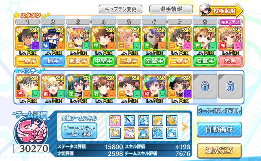 注意点は投手で、蝶属性の恒常投手は全体的にパワー不足になり、直江とおこづかいの河北を使うことになります。中継の野崎はかなり打たれるので、できれば避けたいです。(そして抑え投手は恒常にはいません。)このあたり、持っていればSRの阿佐田(中継、抑)を採用していいと思います。