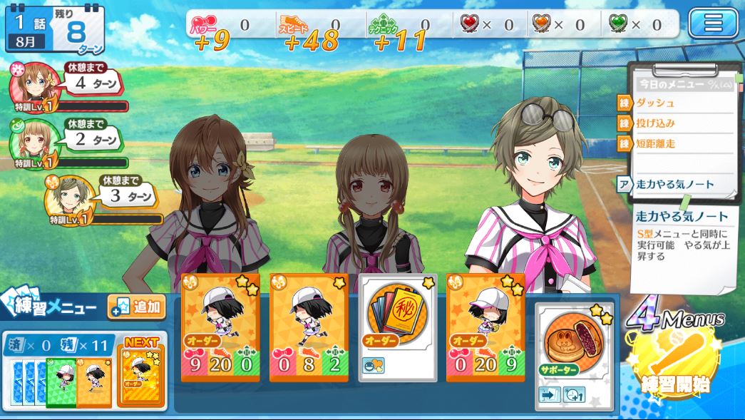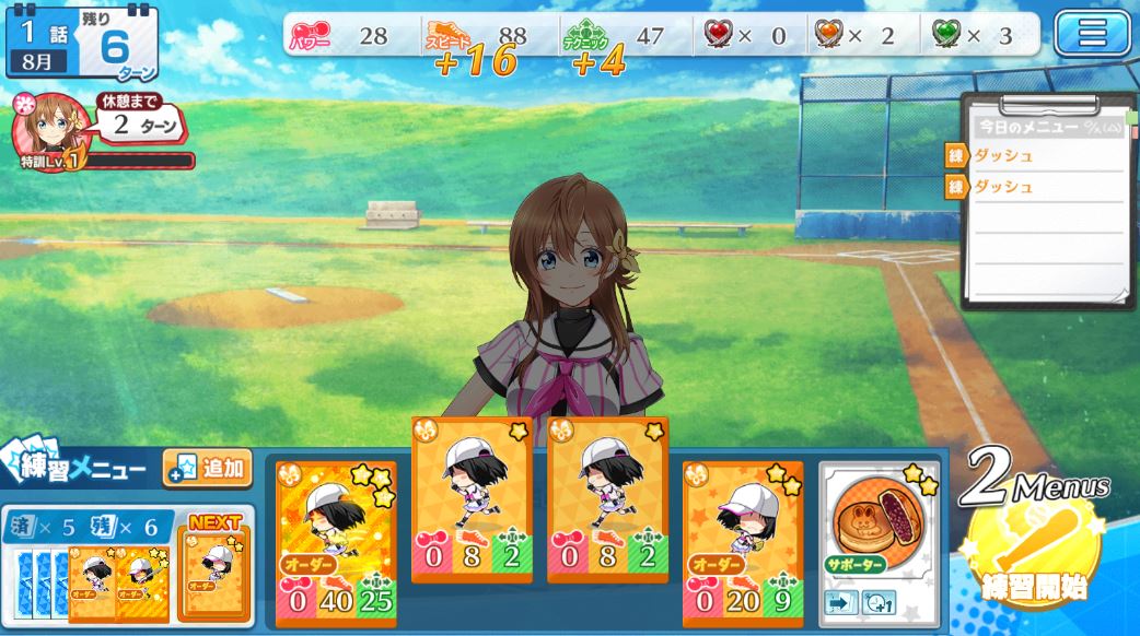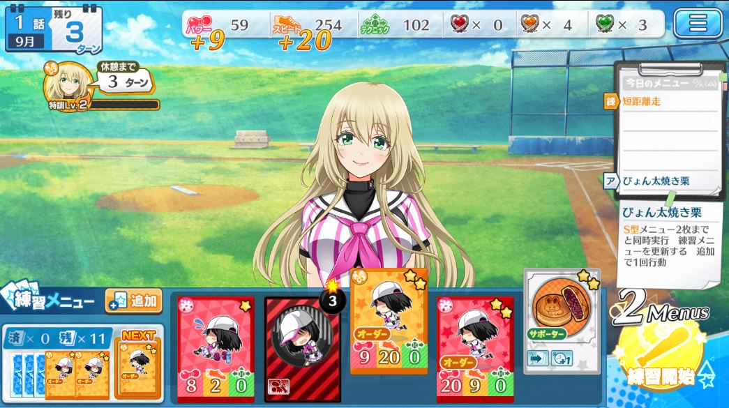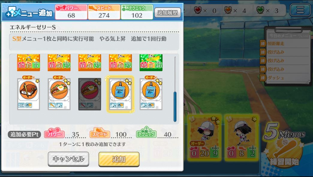 そのうち練習ポイントがたまってくるので、メニュー追加でゼリーやパンを追加します。追加したメニューはそのターンには使えず、次のターンに山札から入ってくる点に慣れましょう。